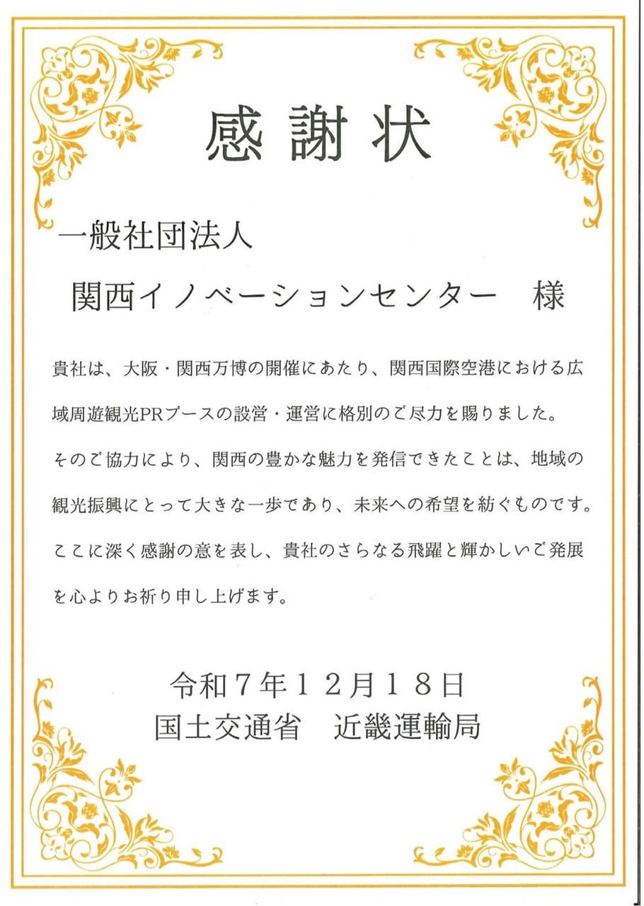 一般社団法人関西イノベーションセンターは、大阪・関西万博における機運醸成への貢献につきまして、国土交通省近畿運輸局より感謝状を拝受いたしましたのでご報告申し上げます。当法人は、今後も新たな取組みに積極的に挑戦し続けることで、日本経済の発展に貢献してまいります。